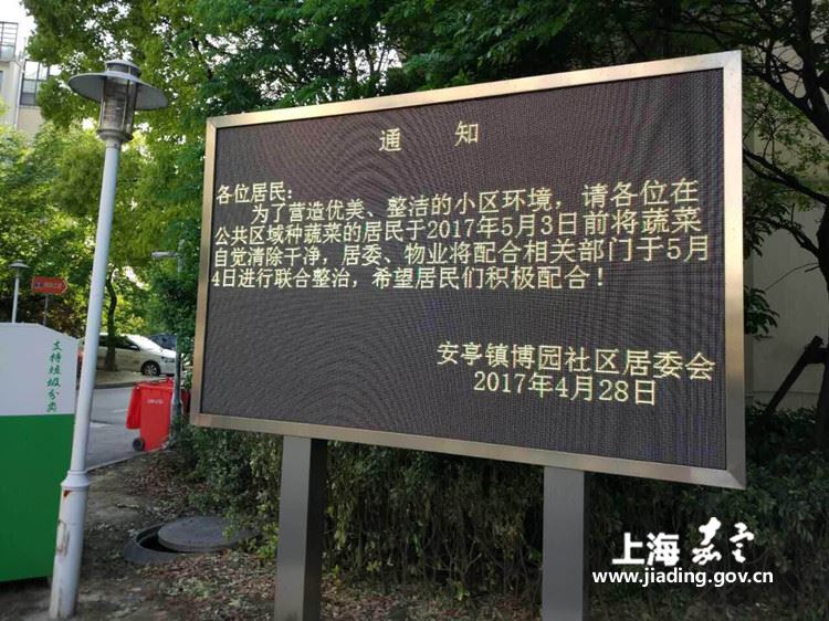 中队经过与居委、物业的讨论,制定了整治方案。当天下午,居委即将通知张贴于小区各处,并在电子屏上进行播放。通知上明确告知业主:于5月3日前将蔬菜自觉清除干净,给予其自行整改的时间。