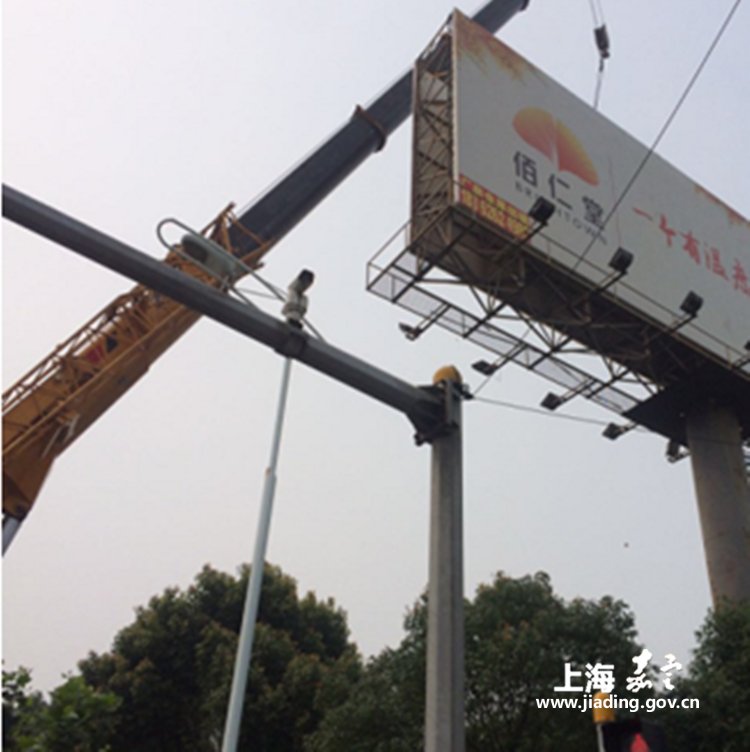 8月19日起,中队安排人员和设备赶赴宝安公路墨玉路口、宝安公路G1501出入口、嘉松北路西园区路等京沪高铁沿线高空广告设置点位对广告进行拆除。行动前,中队已多次与广告单位进行协商沟通,商定由中队委托具备专业资质的施工单位进行拆除。作业现场,施工人员系好安全带,沿着立柱攀爬至广告牌上后,小心翼翼将钢结构进行切割,再由吊车将立面缓缓拉到地面上。中队事前已做好了充分的预案,控制好现场区域,拉好警戒线确保无群众在场以消除安全隐患,并保证施工时不影响道路通行。随着吊机轰隆隆的作业声,一块块大型广告顺利“摘下”,随后清运离场。