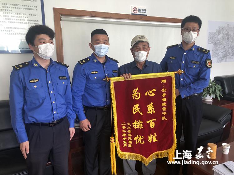 5月7日,一名75岁的退休教师骑着电动车行驶10余公里来到安亭城管中队,送上一面写着“心系百姓,为民排忧”的锦旗,为城管中队的热心为民之举表示感谢。