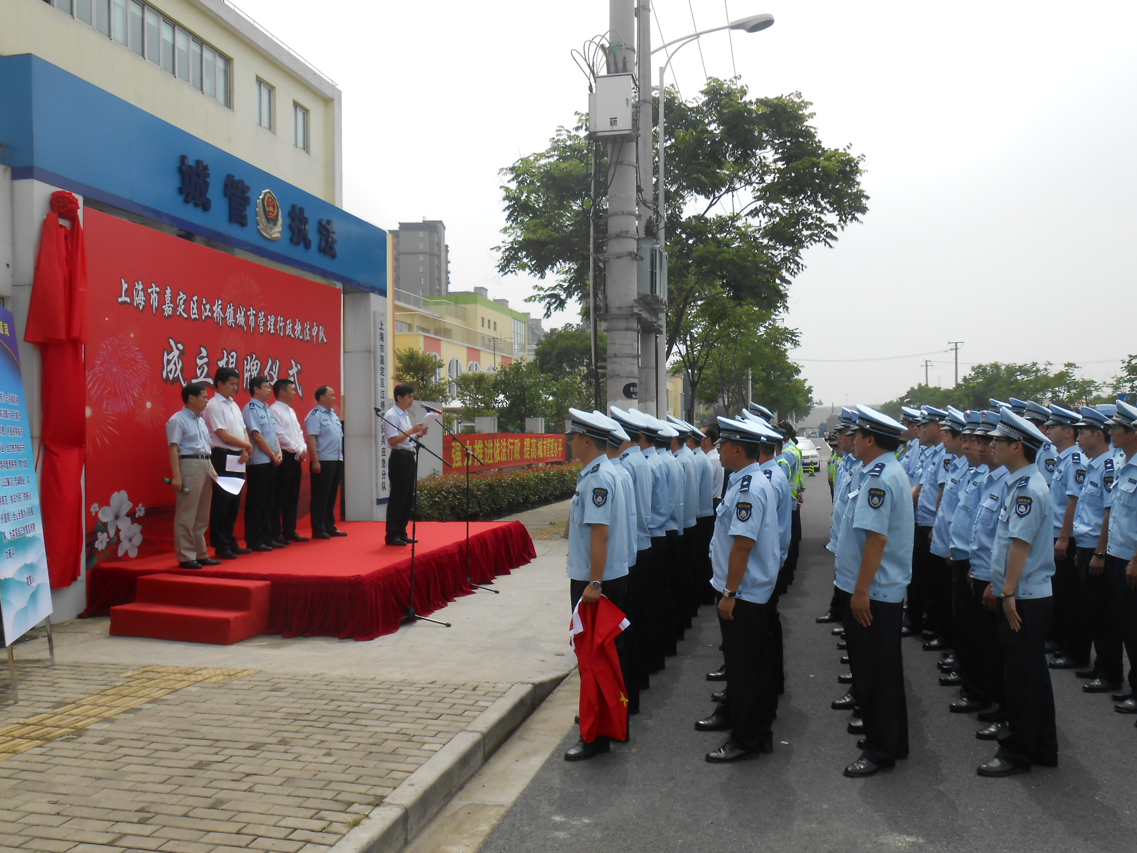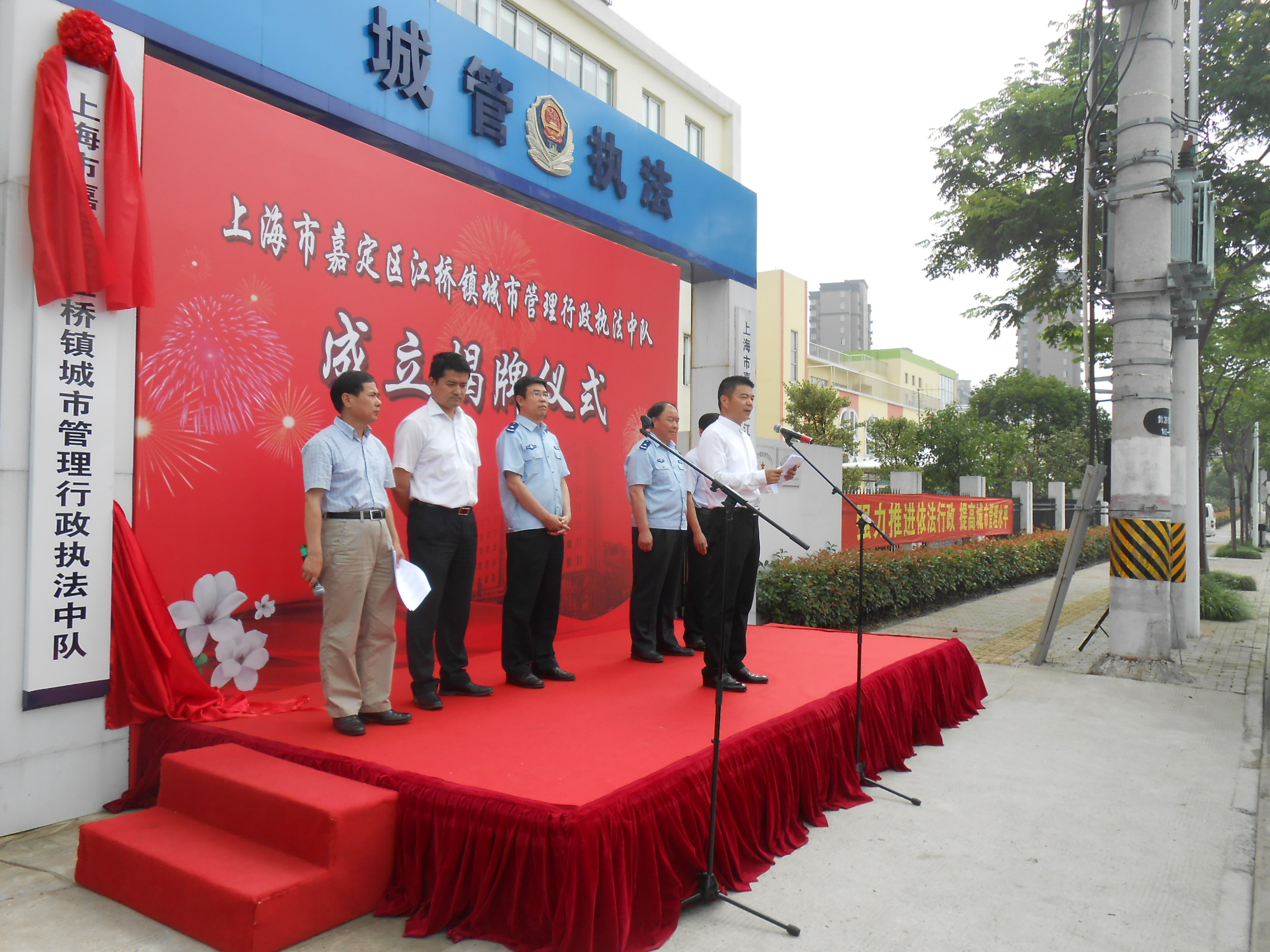 江桥城管执法中队是嘉定区首家成立的镇级城管执法机构。揭牌仪式得到区、镇领导的高度重视。仪式开始前,江桥镇100多名城管执法中队队员和联勤队员整齐列队,欢迎镇三套班子和相关部门领导、区城市管理行政执法局主要领导同志的莅临。在江桥镇党委委员、武装部长戴学月主持仪式下,嘉定区城管执法局党委书记顾忠宝和江桥镇党委副书记、镇长汪洁为中队成立揭牌;镇党委副书记陈政江宣布中队成立决定文件;镇党委副书记魏晓栋宣布中队领导班子成员名单。