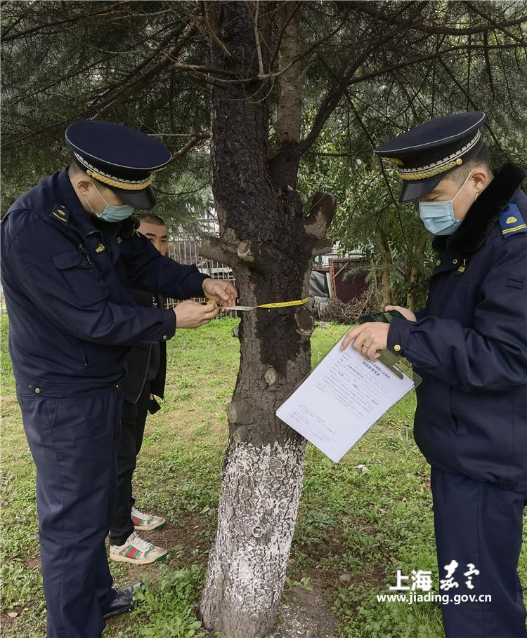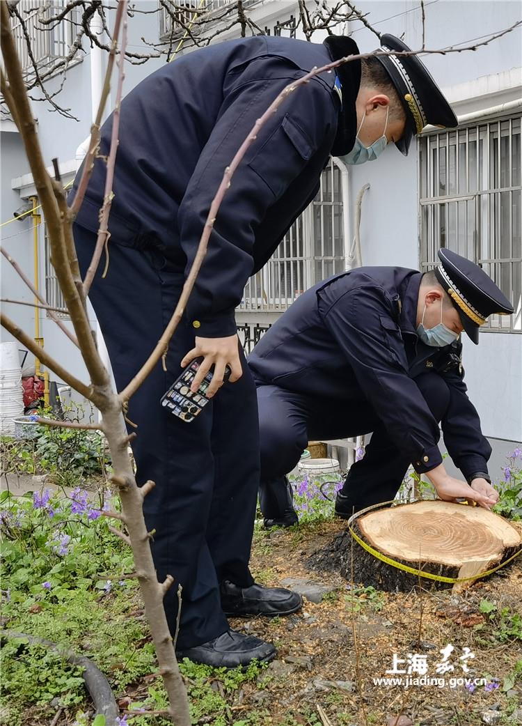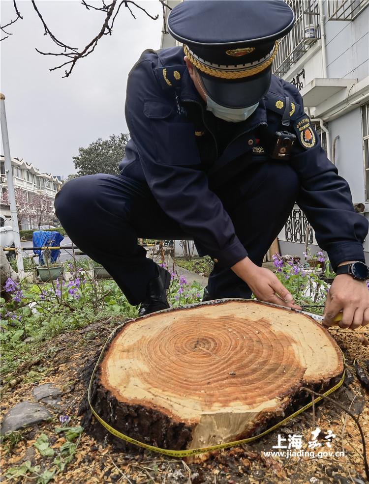 今年3月4日,南翔城管中队接到12345平台派发市民投诉单,反映蕰北路2221弄有人砍伐树木,中队执法人员随即赶赴现场调查取证。