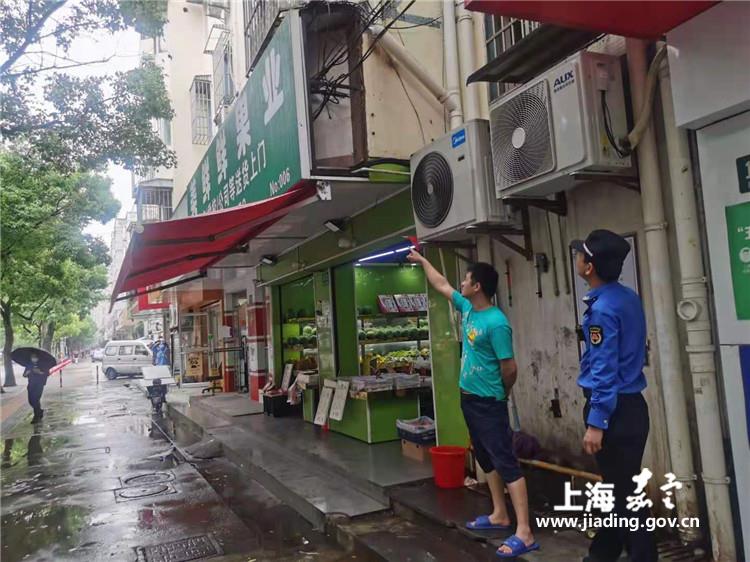 6月19日傍晚,南翔城管中队执法人员巡查至解放街民主街时,发现该处的商业楼顶外立面的有一处违规招牌,且有破损的情况,存在极大的安全隐患。由于地处闹市且上海汛期已至,拆除违规招牌保护市民安全,刻不容缓。按照招牌上信息,执法人员联系了责任商家,要求其立即实施拆除,该商家表示配合执法工作并当承诺自行拆除。为了保障拆除行动的顺利,中队副队长范利华带队,集合执法队员、城管联勤辅助队员,现场指挥调度,保障解放街民主街商业楼楼顶广告拆除工作,于夜晚20:00安全拆除完毕。消除了安全隐患,保障了市民的人身财产安全。